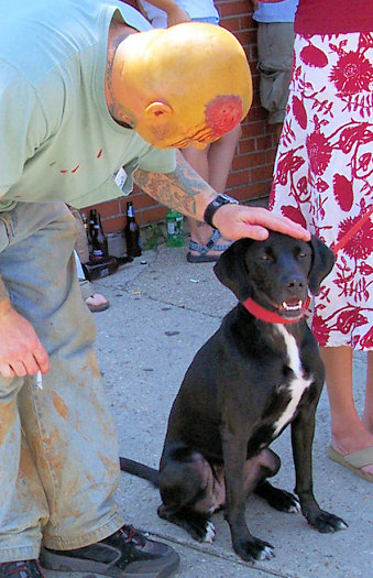 Meanwhile, a nerd zombie catches up on the latest Spiderman adventure while a yellow-face zombie makes friends with a zombie dog (below). |
