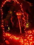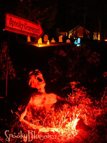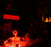 | A signpost points out the entrance to Spooky Hollow. This year saw the appearance of "The Grumble", our man-eating scarecrow. Bruno, his father, is so proud. Bruno retired after a successful 2005 season and now sits in his place of honor (his head does, anyway) over the TV in the family room downstairs. You can hear him at any given time giggling and muttering to himself, plotting his evil plots, and thinking evil thoughts. "The Grumble" is a sinister presence in the mold of his dad, and who now lives in the garage. It's just not safe letting those two get very near each other. |