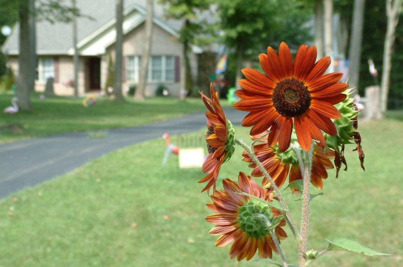 But not quite yet. Snug Harbor, in its baked orange outland splendor, is still alive with color. The birds still swoop and sing, the crickets and cicadas continue their competition for best thousand member vocal group. Tomatoes and watermelons ripen, children ride their tricycles up and down the hot asphalt driveway with jet black feet, and sunflowers riot in gardens and along fence rows. Summer abides. |