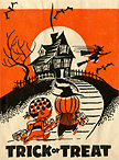 Little paper treat bags - great for holding popcorn, candy corn, and all other forms of nutritional litter. They came in a large variety of happy, spooky, and sometimes downright disturbing designs. Most had the same message of "Trick or Treat" while others implored their heathen recipients, "No tricks, please!" I was always fascinated by the little pictures. Thanks to Richard Miller at SpookShows.com, we have a whole herd of these neat little bags to show you.