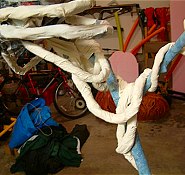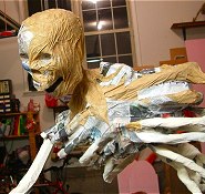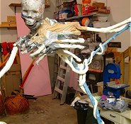 During the skinning process, you may discover that your skeleton has a few Gigeresque accoutrements, often due to certain engineering accommodations. You can leave them alone or apply camouflage. Bumps can be smoothed into humps (the difference between Igor and Igor with a bus sticking out of his back) by packing wadded newspaper around the bus, then skinning over the whole area. Alternatively, a few scraps of cloth tacked on here and there work well to conceal the odd structural snafu.