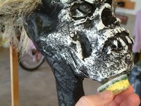 Her thumb-in-a-light socket hairstyle was made from a foot or two of debraided sisal rope. Just unravel some rope, gather into "plugs", and attach one end to the scalp with hot glue. I love this stuff. Sisal rope is a versatile tool for all sorts of haunt applications. Unlike Nylon rope or clothesline, sisal rope looks old. Its aged appearance, and exceptional strength, make it the perfect solution for lashing Grumbles to trees, tying convincing nooses, hanging signs, and rigging 50lb skeletons from garage ceilings.