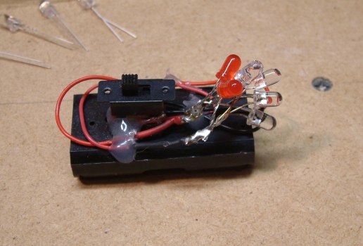 Note: Seasoned electronics gurus will immediately note the lack of any kind of current limiting resistor. Strictly speaking, there should probably be a 150 Ohm resistor added to one leg of every LED to drop extra voltage in the event that that LED is the only one drawing current for a given instant. Since there are usually two or three LEDs lit at once, munching up all those Volts, I left it out. If that bugs the hell out of you, then now you know how to fix it. |
