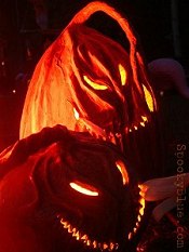These demented denizens of the pumpkin patch, twin blotches of vegetable nightmare, are so terrible, so unpleasant, so utterly corrupt that zombies avoid them for fear of being eaten.  They're twin traumas with orange eyes and saw blade teeth.  Smash a pumpkin in their neighborhood and there won't be anything left of the vandal for the police to identify.  No witnesses, either.  Just a slither, "snap!" and "crunch, crunch, crunch!"