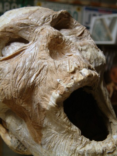 Add extra bits of latex-towel-pulp around the eye sockets and pinch it to form eyelids, drooping skin layers, or whatever grossness you can think of. I especially enjoyed adding eye ridges. I dug an angry, furrowed brow with just a few strokes. You'll need two or three layers of "skin" to really take advantage of this technique, but once you see how easy it is to add these details, you'll wonder where the time went. |