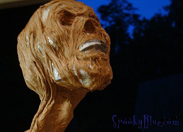 Here is an example of a paper skull mounted on its neck bone, then a little while later...brrr. Creepy zombie. I hope yours are as creepy. If you found this write-up helpful, please let us know! Have fun haunting!