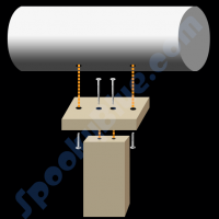A two inch vertical beam (1x2x2) is attached to a four inch length of 1×2 lumber with two 1″ wood screws, forming a “T”. This is mounted to the can with two 1.25″ hex bolts. Drill holes for the mounting bolts through the wall of the can on either side of the lamp assembly.